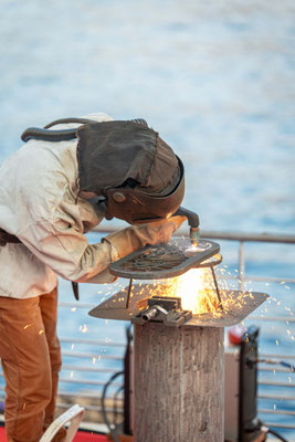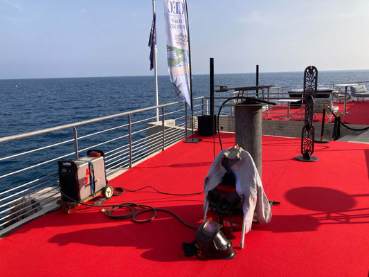 - Utilisation pendant 45 minutes d'un poste plasma 105 A pour découpe d'acier 20 mm d'épaisseur sur établi réalisé spécialement pour l'occasion afin de terminer l'oeuvre en public ;
